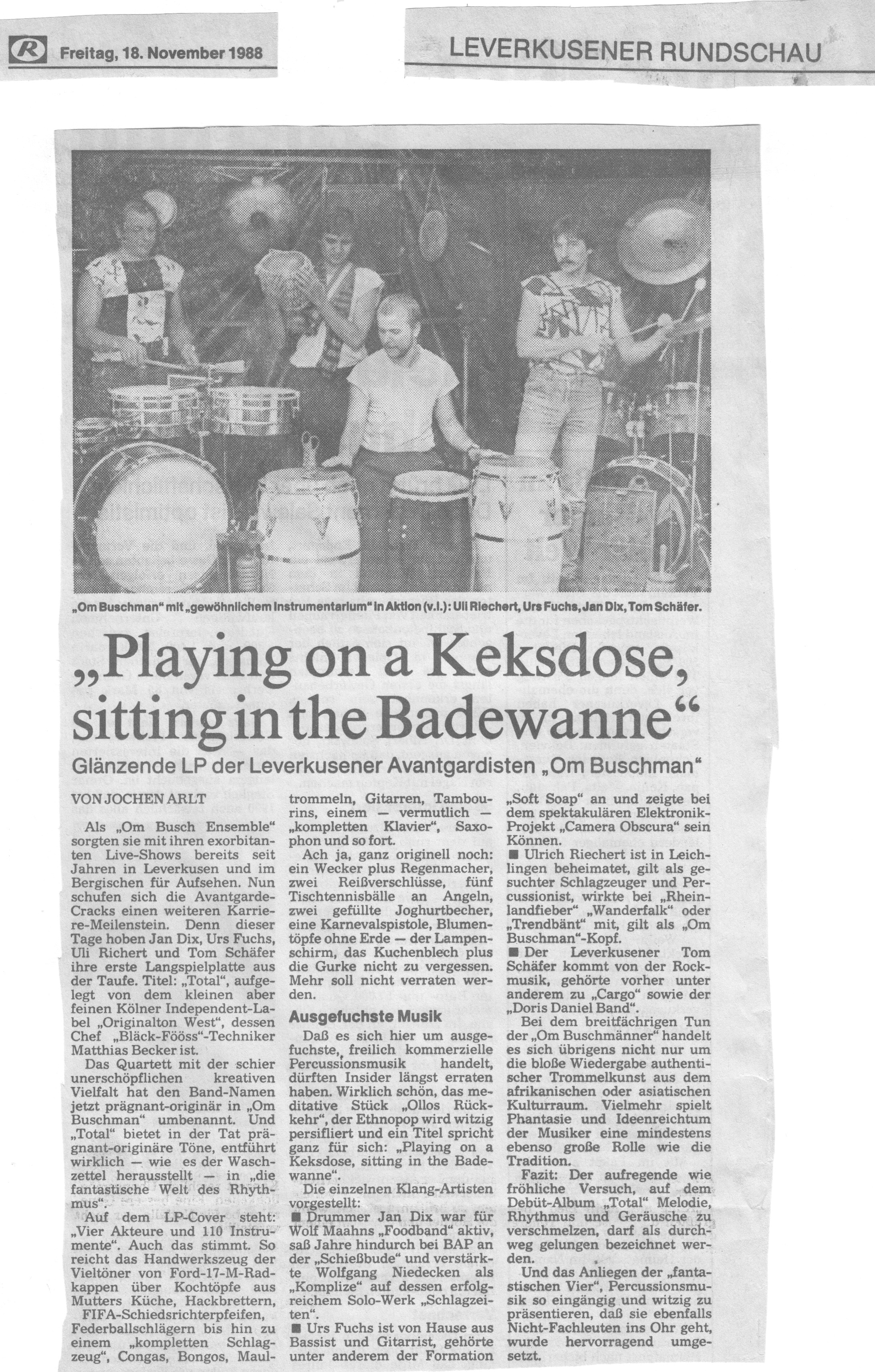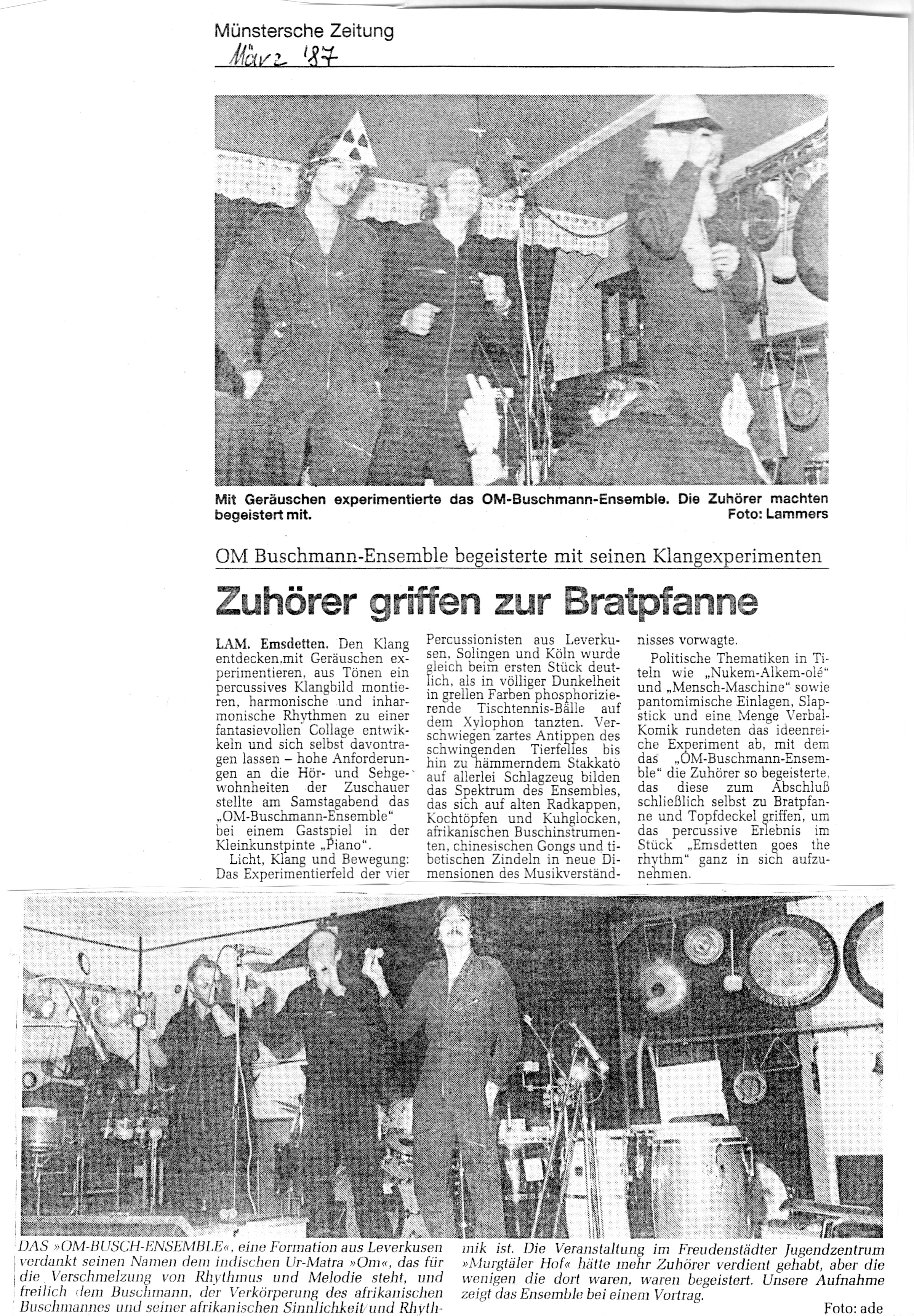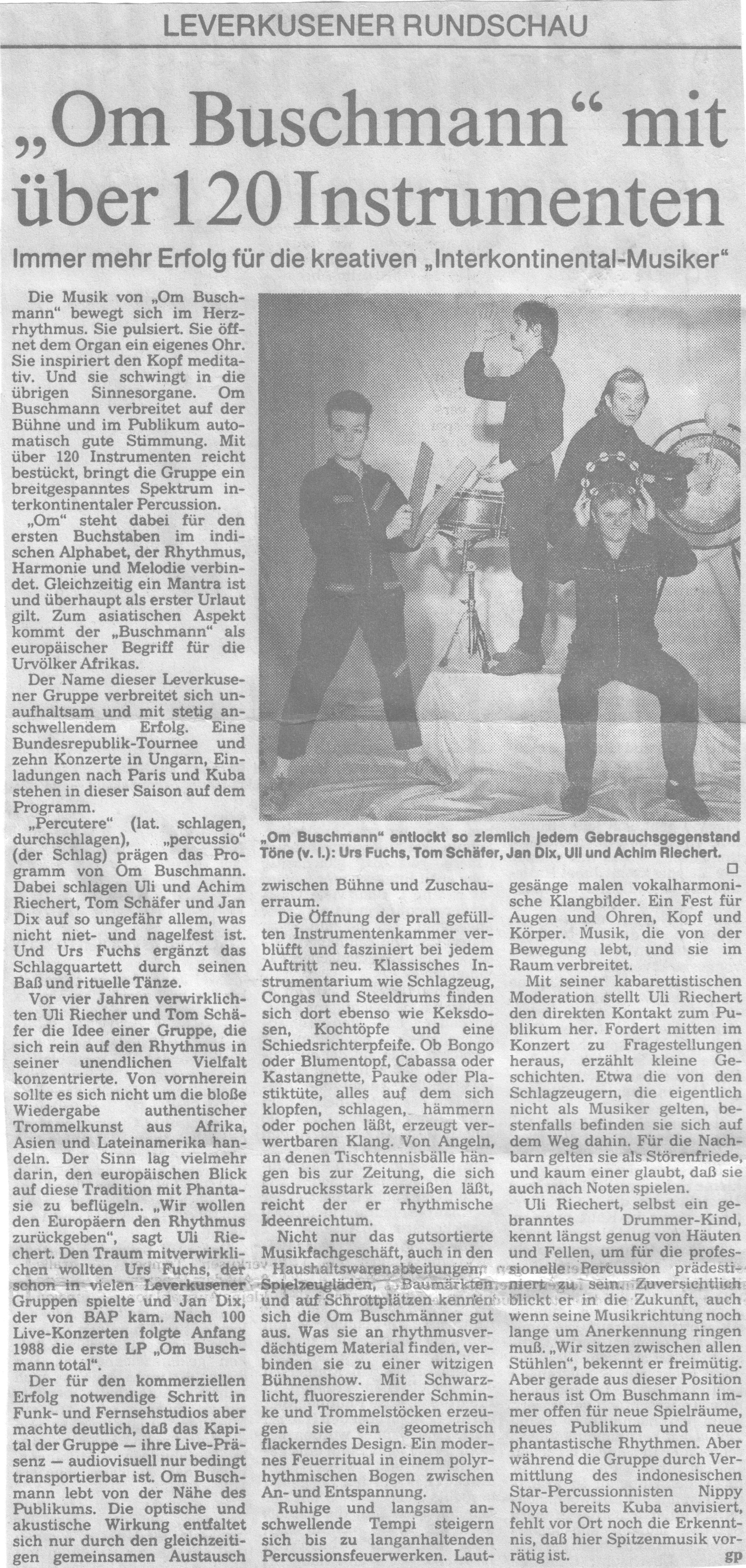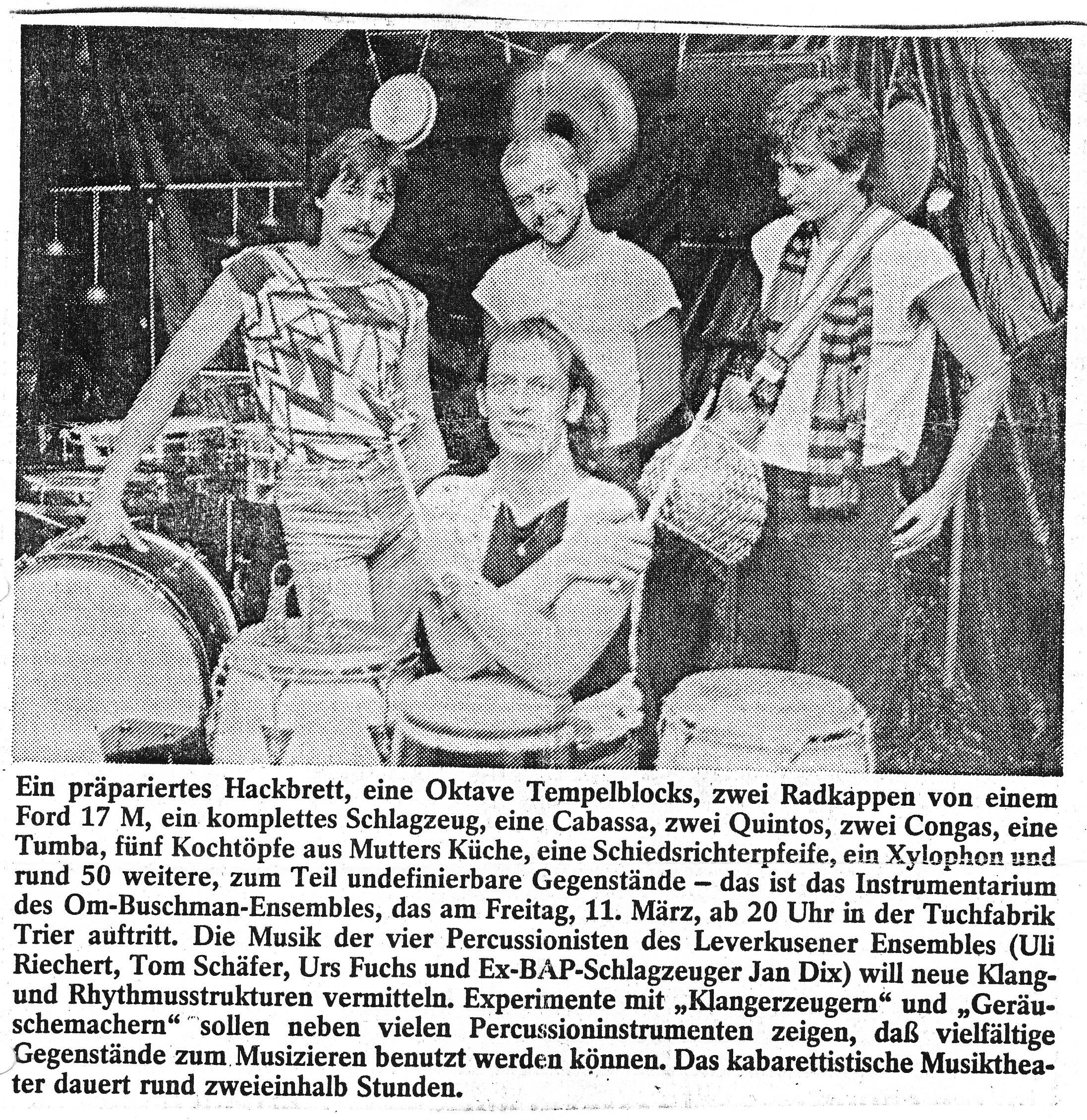 Auch-mit-Radkappen-Klangbilder-gemalt-Kaarst Brisantes-Trommelfeuer-bestach-wie-Ursonat-Morsbroich-08.09.87 Buschmänner-machen-eine-großes-Tamtam-19.20.08.89 Das-Om-Buschman-Ensemble.-Dez.-85 Das-Rhythmusspektakel Die-vielfältige-Welt-des-Rhythmus-vorgeführt-21.03.1989 Ex-BAP-Musiker-im-exotischen-Trommel-Rausch express Farbtupfer-tanzen-zum-Takt-des-Tennisschlägers-15.04.89-Künstlerbunker-Karlstr Hochkarätigste-Performance-2-28.03.1989 Hochkarätigste-Performance-Kaufbeuren- In-fremde-Welten-der-Klangerlebnisse-geführt-03.10.1988 Infantil-bis-infernalisch Jagt-ins-Bockshorn-Sommerhausen-23.12.87 Magische-Töpfe-und-Dosen-15.04.1989-1 MIt-Joghurtbecher-Musik-gemacht-01.09.87- Mit-Töpfen-und-Pfannen-07.03.87-Heilbronn Musik-aus-Schrott-Theaterkeller-Göttingen Musikalische-Illusion-bis-zum-Gespenstischen-14.06.88-Remscheid Musiktheater-zum-Nachdenken-Kaarst-21.11.86 Om-Buschman-mit-über-120-Instrumenten-August-1989 Om-Buschman-trommelt-05.04.89-Göttingen Playing-on-a-Keksdose-sitting-in-the-badewanne-18.11.1988- Raffinierte-Rhythmen-aus-dem-Inneren-eines-StofftiersJahnhalle-1988 Rhythmus-als-farbiges-Fest-07.04.87-Freudenstadt- Rhythmus-total-im-Unart-1985 Tufa-Trier Verschmitz-ironisches-Unterhaltungs-Allerlei-Dschungel-22.11.87- Vier-Schlagtheatristen-Dehnberger-HofTheater Zuhörer-griffen-zur-Bratpfanne-März-87-Emsdetten-