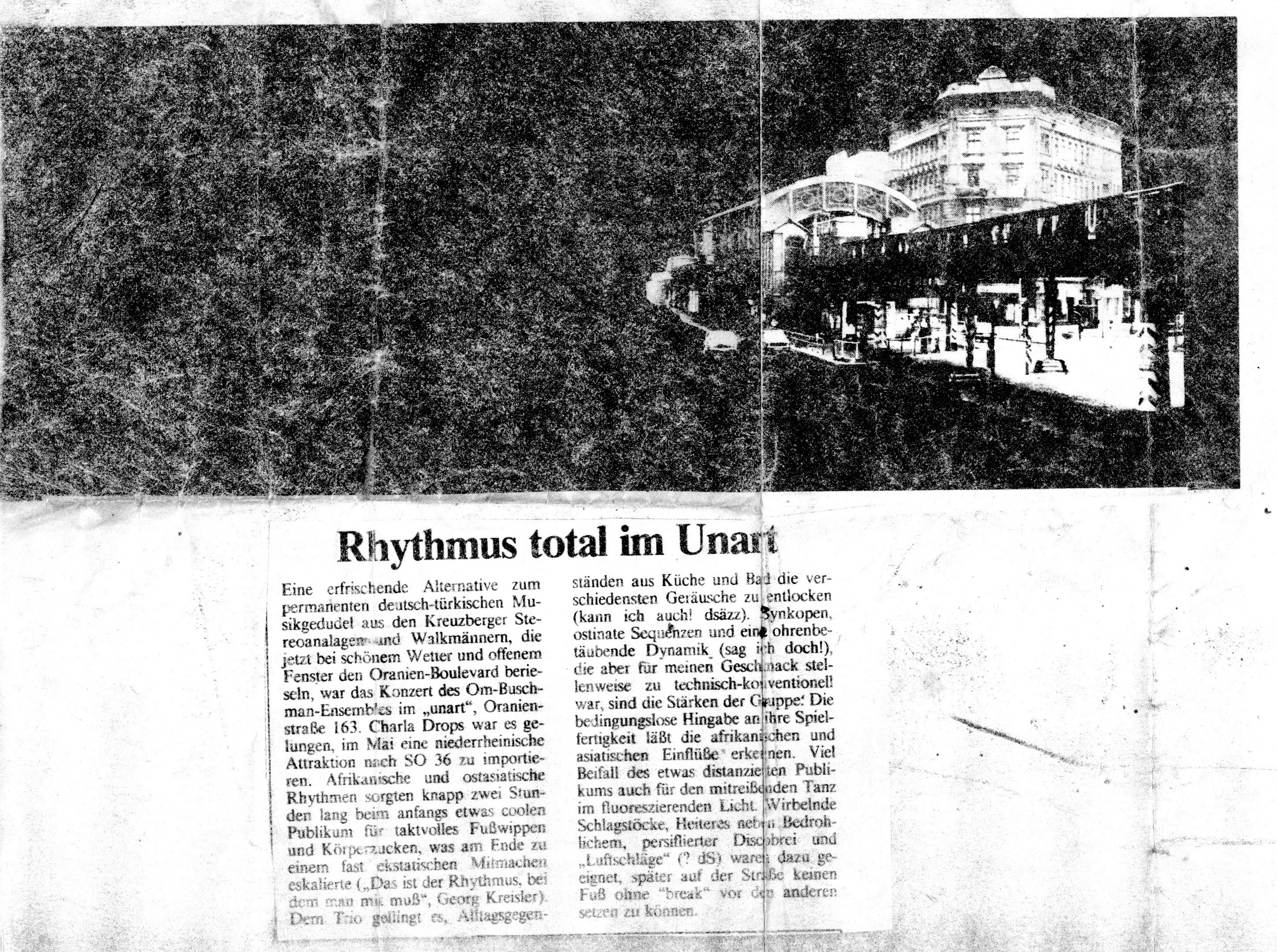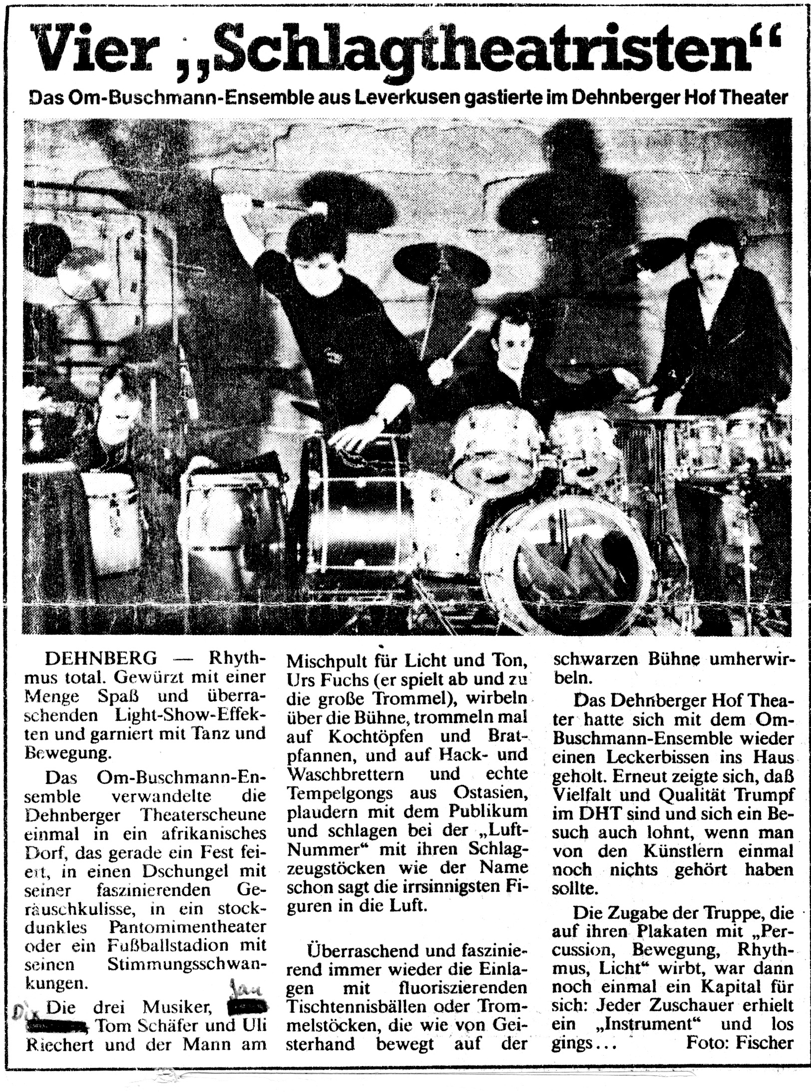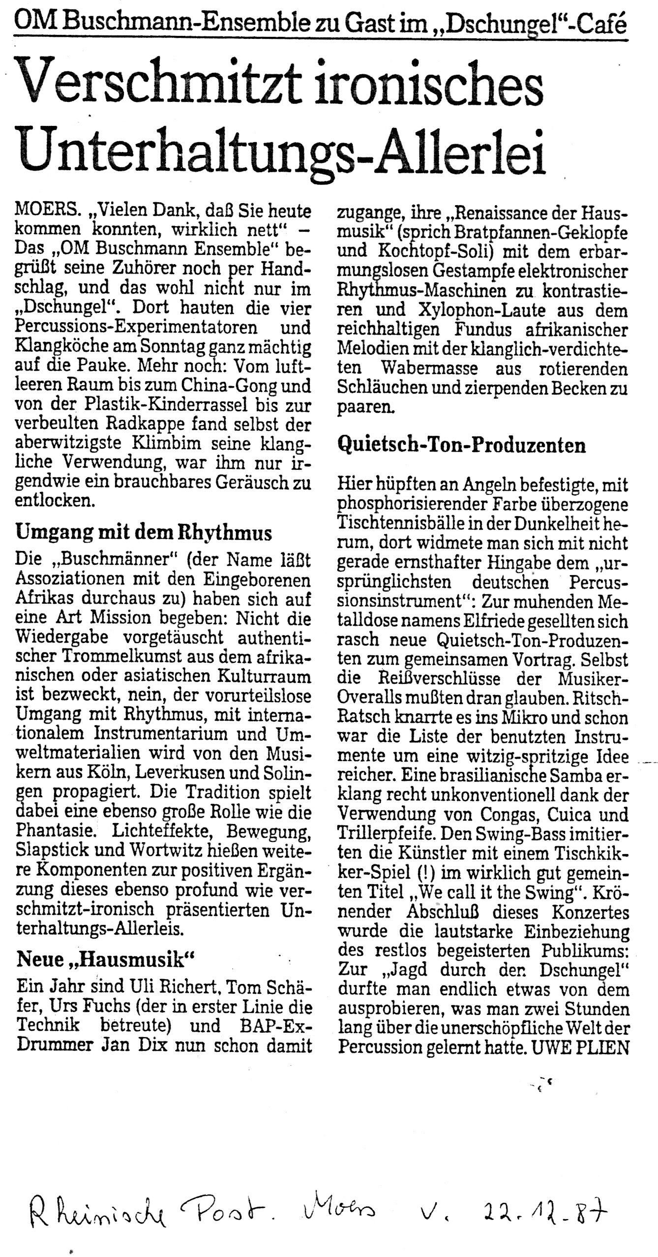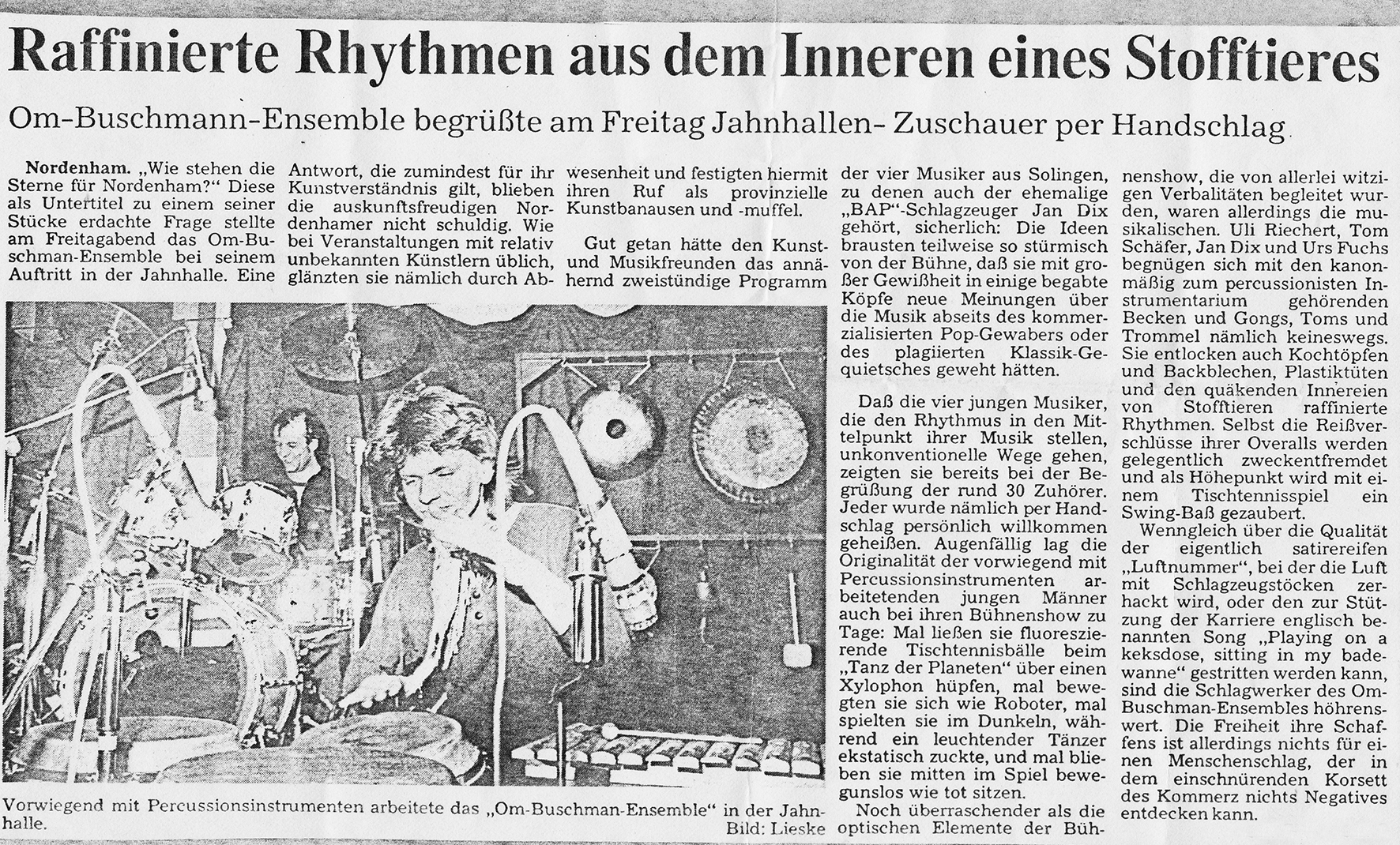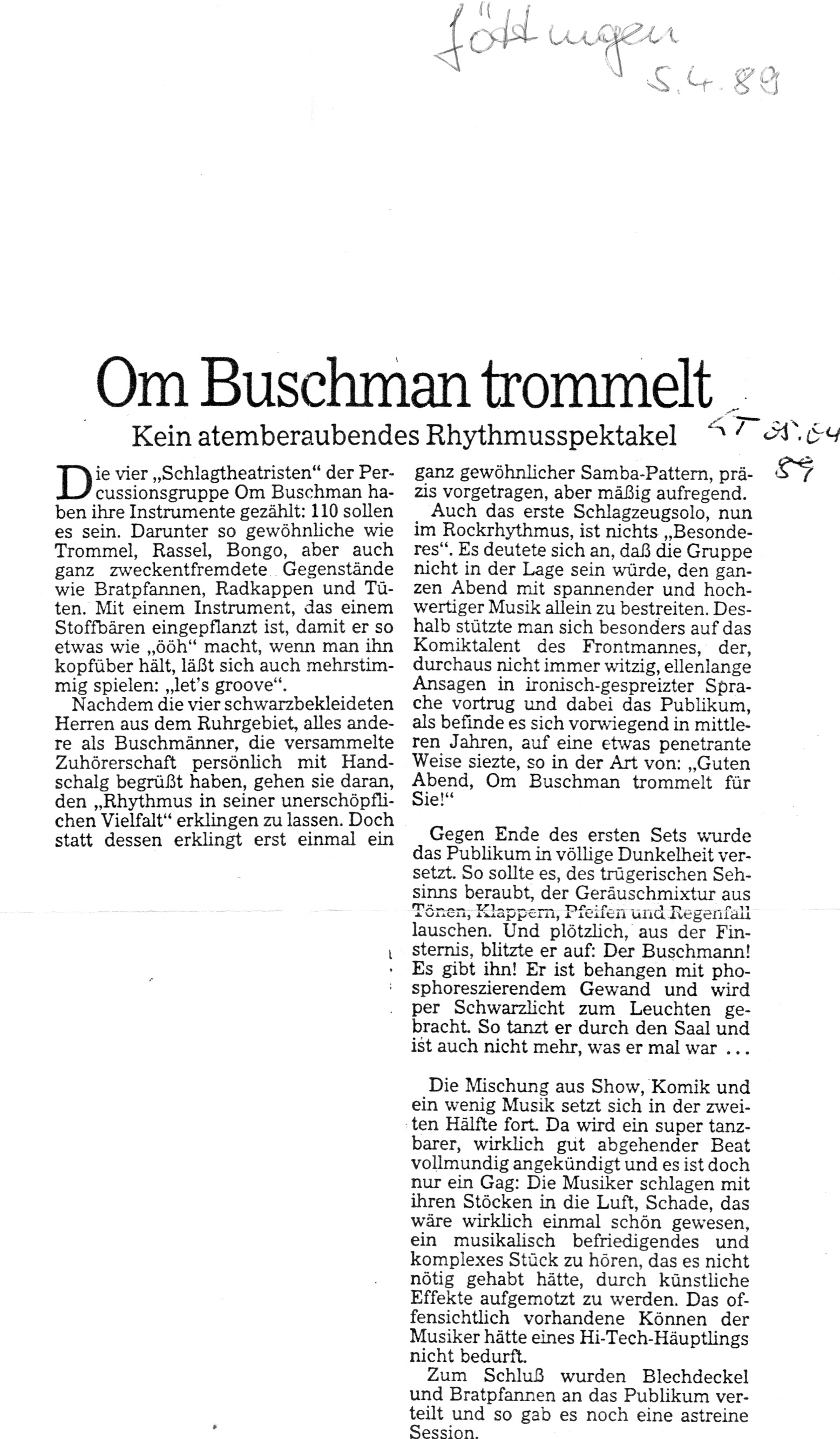Auch-mit-Radkappen-Klangbilder-gemalt-Kaarst Brisantes-Trommelfeuer-bestach-wie-Ursonat-Morsbroich-08.09.87 Buschmänner-machen-eine-großes-Tamtam-19.20.08.89 Das-Om-Buschman-Ensemble.-Dez.-85 Das-Rhythmusspektakel Die-vielfältige-Welt-des-Rhythmus-vorgeführt-21.03.1989 Ex-BAP-Musiker-im-exotischen-Trommel-Rausch express Farbtupfer-tanzen-zum-Takt-des-Tennisschlägers-15.04.89-Künstlerbunker-Karlstr Hochkarätigste-Performance-2-28.03.1989 Hochkarätigste-Performance-Kaufbeuren- In-fremde-Welten-der-Klangerlebnisse-geführt-03.10.1988 Infantil-bis-infernalisch Jagt-ins-Bockshorn-Sommerhausen-23.12.87 Magische-Töpfe-und-Dosen-15.04.1989-1 MIt-Joghurtbecher-Musik-gemacht-01.09.87- Mit-Töpfen-und-Pfannen-07.03.87-Heilbronn Musik-aus-Schrott-Theaterkeller-Göttingen Musikalische-Illusion-bis-zum-Gespenstischen-14.06.88-Remscheid Musiktheater-zum-Nachdenken-Kaarst-21.11.86 Om-Buschman-mit-über-120-Instrumenten-August-1989 Om-Buschman-trommelt-05.04.89-Göttingen Playing-on-a-Keksdose-sitting-in-the-badewanne-18.11.1988- Raffinierte-Rhythmen-aus-dem-Inneren-eines-StofftiersJahnhalle-1988 Rhythmus-als-farbiges-Fest-07.04.87-Freudenstadt- Rhythmus-total-im-Unart-1985 Tufa-Trier Verschmitz-ironisches-Unterhaltungs-Allerlei-Dschungel-22.11.87- Vier-Schlagtheatristen-Dehnberger-HofTheater Zuhörer-griffen-zur-Bratpfanne-März-87-Emsdetten-